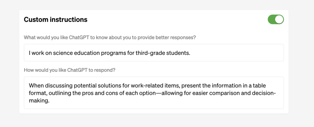 No more blank slates: Previously, every new message thread with ChatGPT started from a blank slate, meaning the model didn't have any context from previous interactions. With custom instructions, you can now set the tone and context for the entire conversation.