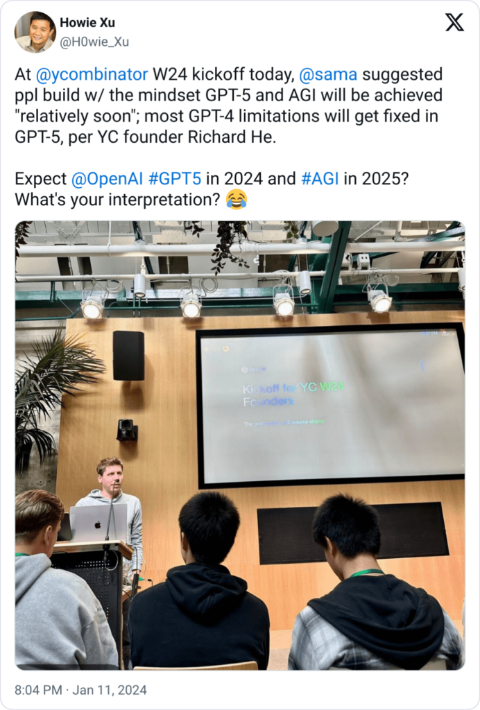 Why does this matter? The CEO of OpenAI (ChatGPT) is telling founders of their new tech startups that AGI will be achieved so soon, that they should build your company knowing it's closer than further away.